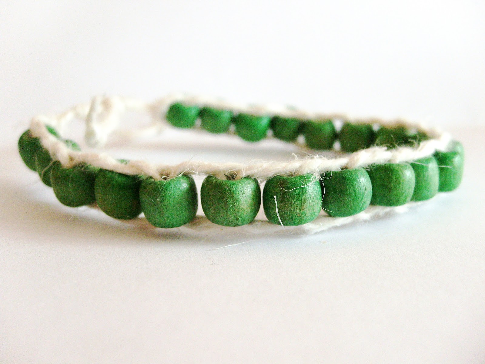 Po raz pierwszy sznurek i drewniane koraliki.... w kolorze groszkowej zieleni.